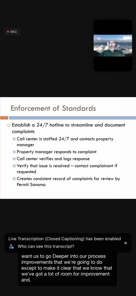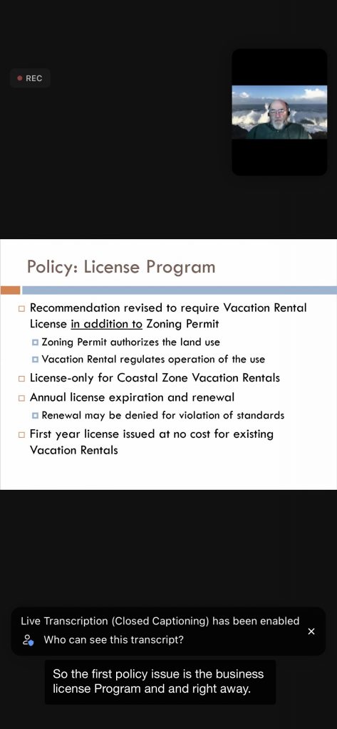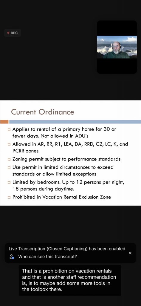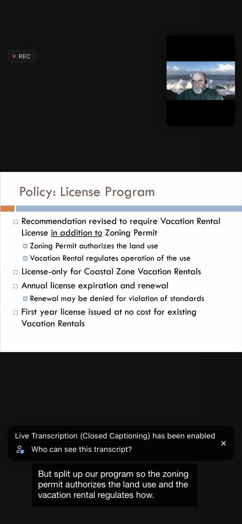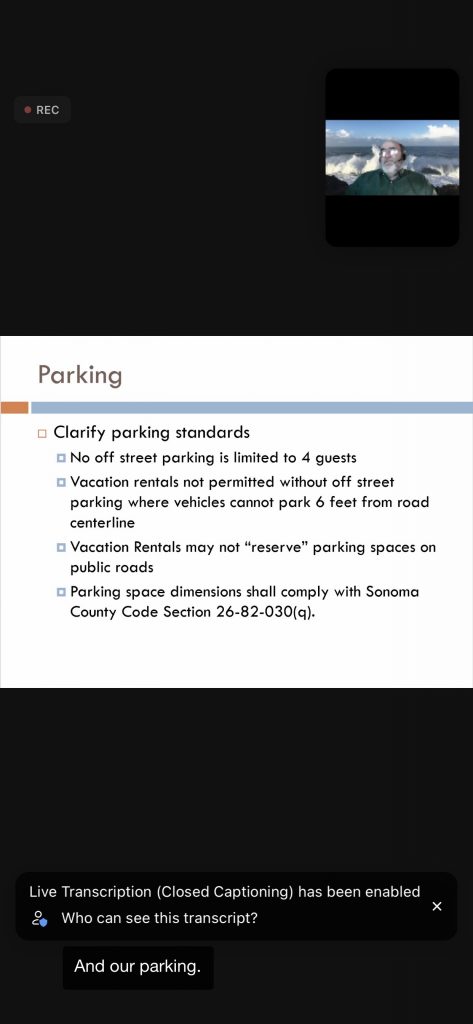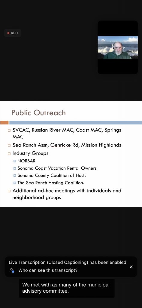 The county planning staff (Permit Sonoma) went over their plans for a new Vacation Rental Ordinance that will encompass the entire county. First the Local Coastal Plan (LCP) needs to be finalized. Then the VR Ordinance – the “Coastal Zone” portion – can be finalized and approved by county officials and the CA Coastal Commission.