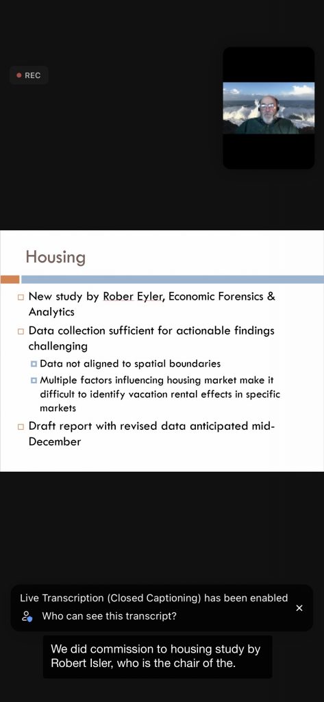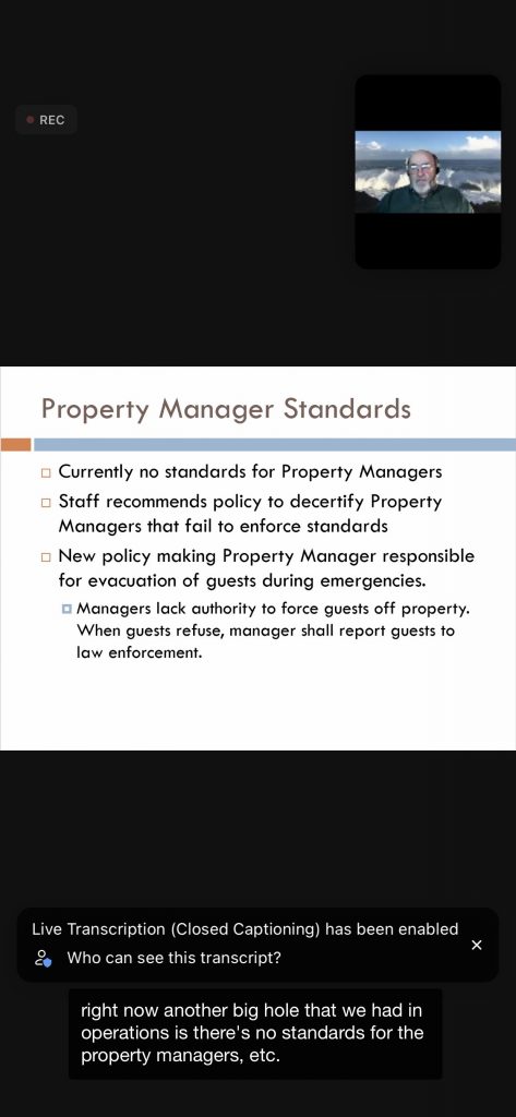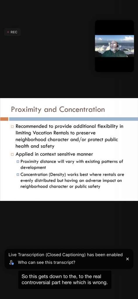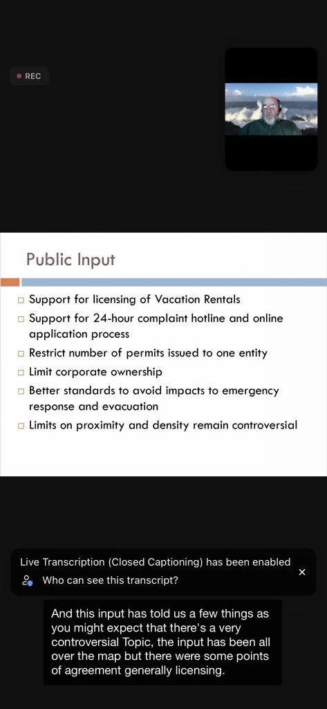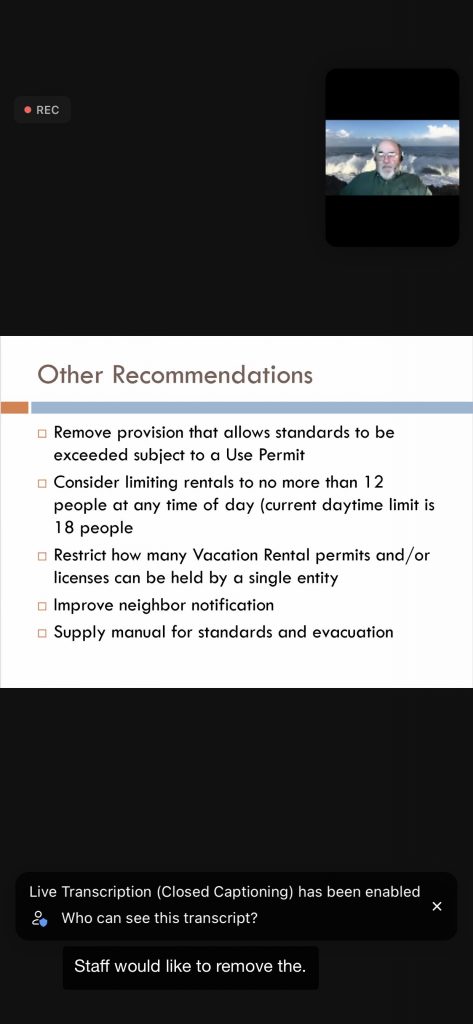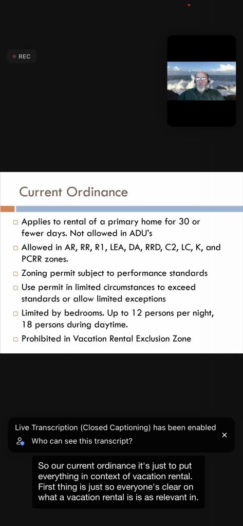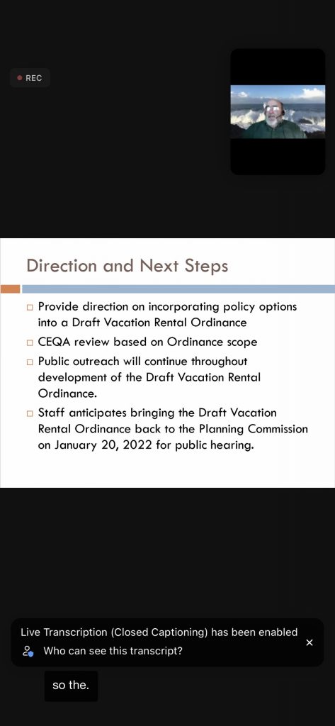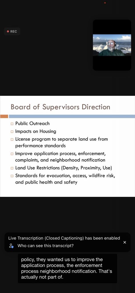 Below are 15 slides from the 11/18/21 Planning Commission VR Workshop – the PRMD Presentation text is on white background (the screen shots show the black background — a photo of Gary H/Planner at top of each – and the transcript at the bottom – ignore the black portions):